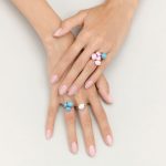 Choisir votre tour de doigtÉvoquant la nature luxuriante du paysage méditerranéen, la forme arrondie de cette bague Capri en céramique blanche est sublimée par la couleur de minuscules gemmes contrastantes.
