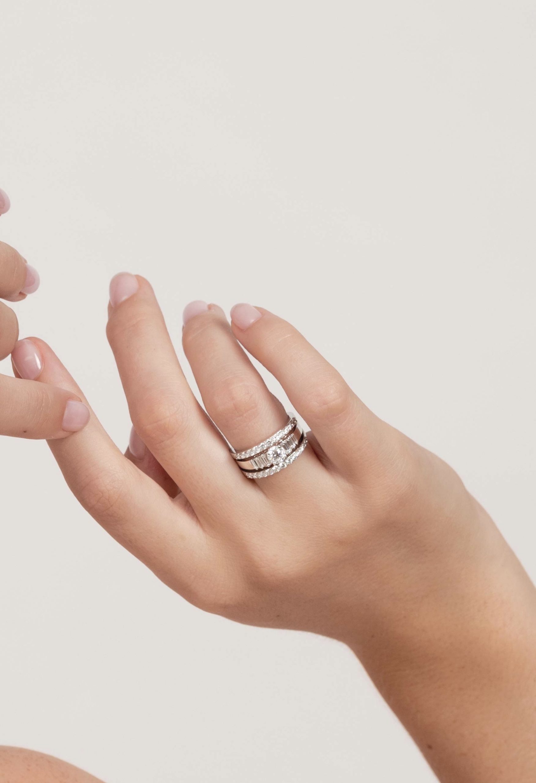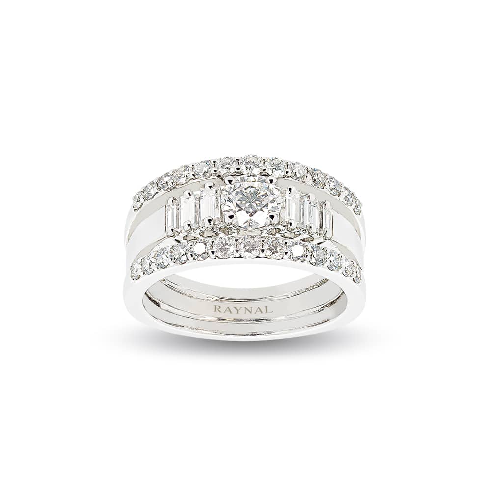 La bague Hera est une pièce de joaillerie haut de gamme fabriquée par la Maison Raynal Joaillier. Elle est fabriquée à partir d’or blanc 18 carats et est ornée d’un diamant taille brillant centrale est entourée de diamants baguettes et brillants, qui ajoutent à la brillance et à l’éclat de la bague.