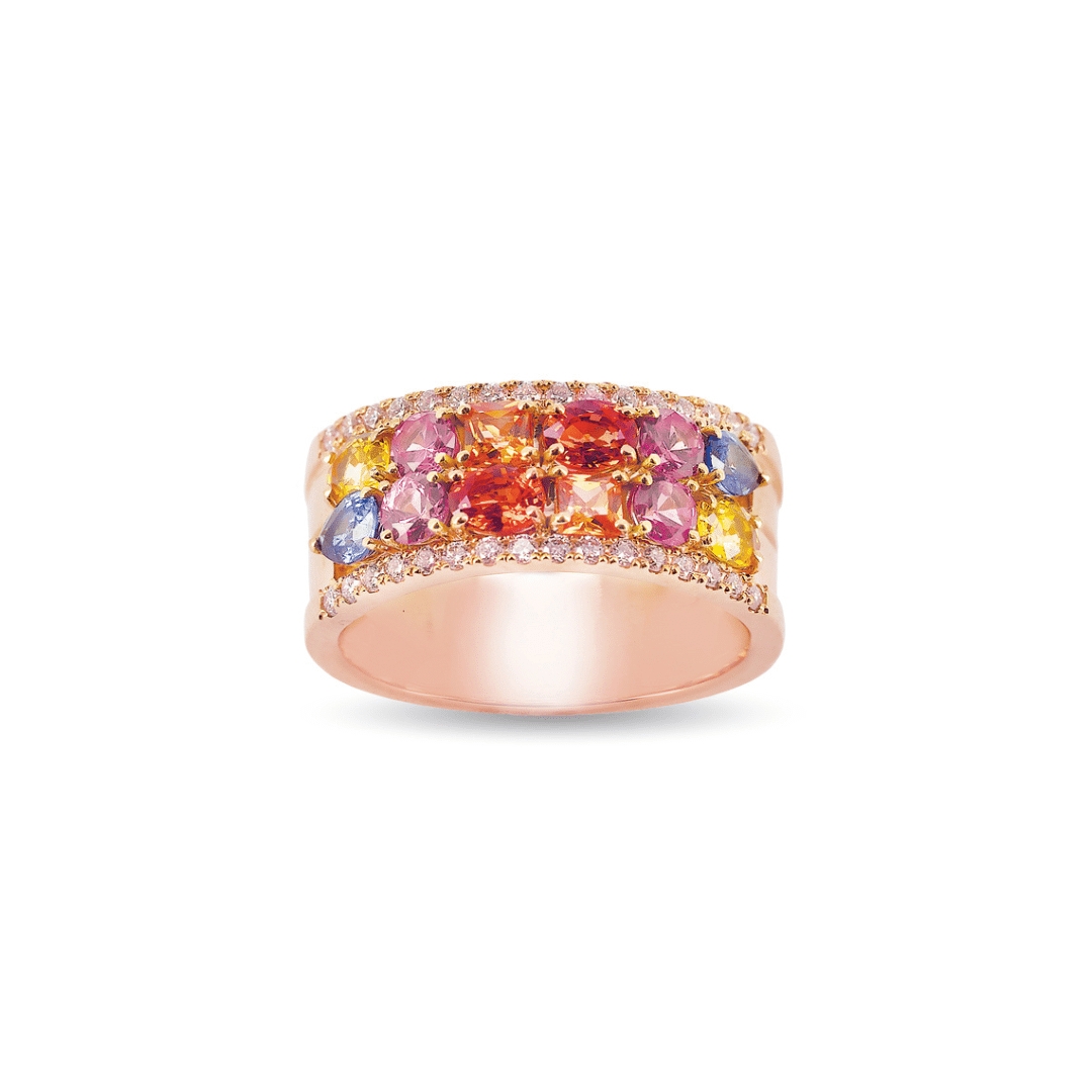 Choisir votre tour de doigtBague or rose 18 cts diamants et saphirs multicolores.