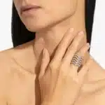 Avec un pavage de 195 diamants d’une qualité G-VS pour un total d’environ 1 carat, cette bague Stairway est sûrement une pièce très élégante et scintillante. La largeur de 2,4 cm est également assez imposante, à porter au majeur ou à l’ndex.