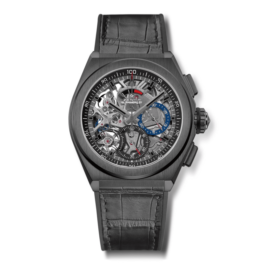 Montre El Primero 21 avec mouvement de chronographe haute fréquence affichant 1/100e de seconde, logée dans un boîtier DEFY en céramique noire de 44 mm et rehaussée d’un bracelet en cuir d’alligator noir et caoutchouc.