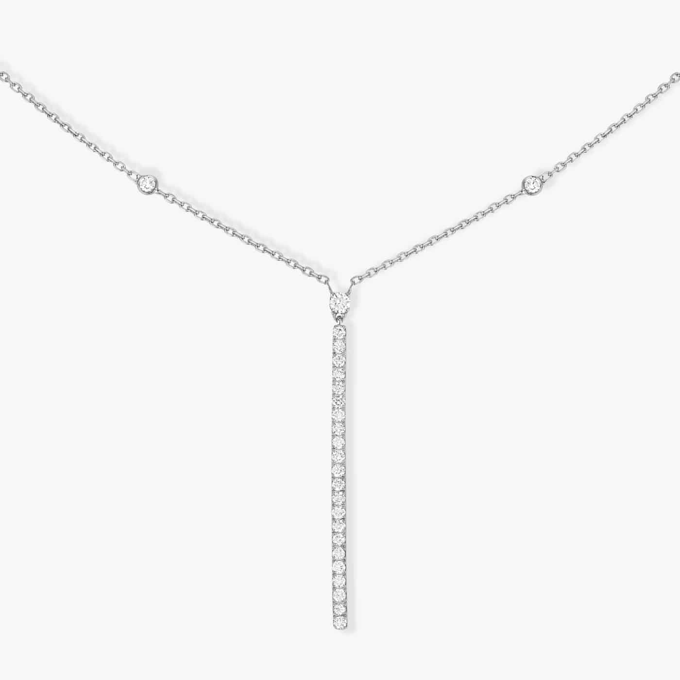 L’éclat discret de l’or blanc qui le compose en fait un métal de prédilection, y compris des femmes qui n’ont pas l’habitude de porter des bijoux de luxe. L’élégance graphique de ce bijou femme réside dans la pureté d’une ligne verticale de diamants scintillants où l’or se fait le plus discret possible. Un must-have de la boite à bijou, qui ornera avec délicatesse tous les décolletés. Petit détail: la chaîne en or blanc est ornée de quelques diamants sertis clos. Vous aimez le collier diamant barrette verticale en or blanc Gatsby ? Associez-le avec une bague ou un bracelet diamant de la même collection pour un look tout diamant !