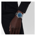 Montre DEFY Skyline dotée d’un boîtier octogonal en acier de 41 mm rehaussé d’une lunette à facettes, avec un cadran bleu à motif soleillé revisitant l’emblématique étoile à quatre branches de ZENITH. Animée par le mouvement de manufacture automatique à haute fréquence El Primero 3620 avec le tout premier indicateur au 1/10e de seconde. Bracelet en acier interchangeable et bracelet en caoutchouc à motifs bleus.