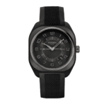 Montre en composite de graphène et lunette en céramique satinée soleil avec chanfreins polis miroir, minuterie décalquée gris, mouvement de Manufacture Hermès H1837, cadran traité or noir, centre grainé, bracelet en caoutchouc noir