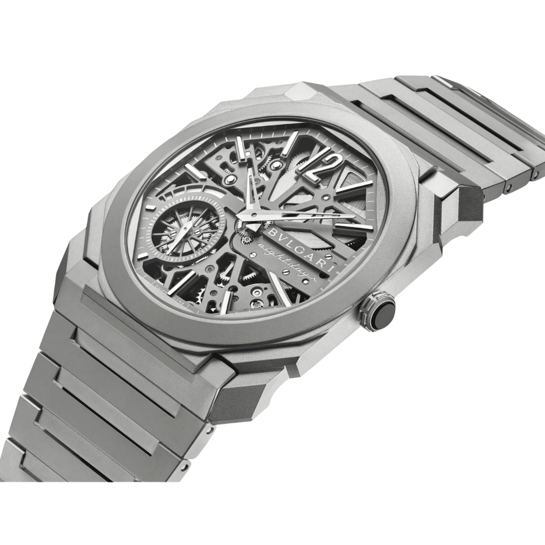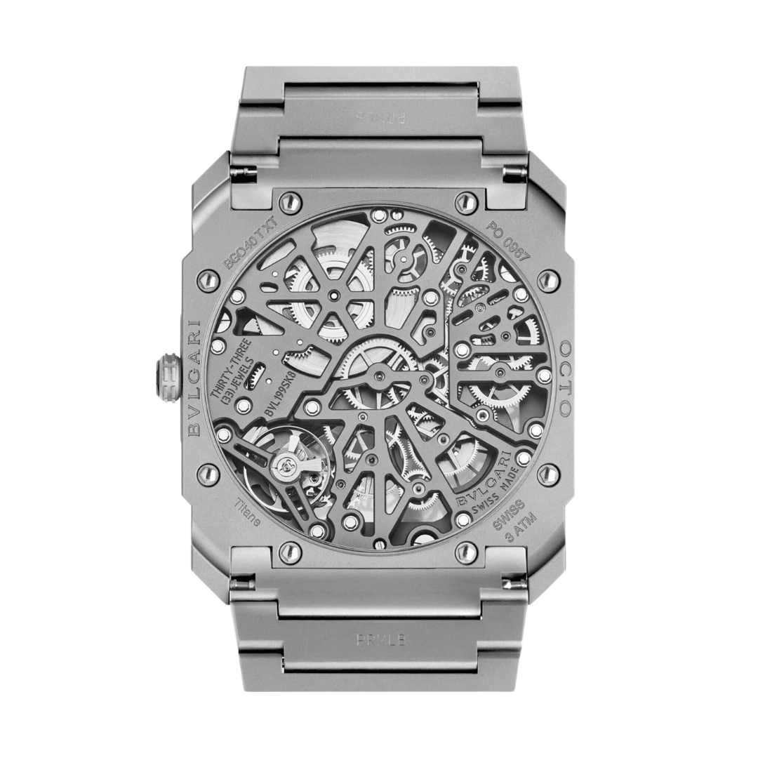 Montre Octo Finissimo Squelette 8 jours dotée d’un mouvement mécanique de manufacture extra-plat à remontage manuel, d’un calibre BVL 199 SK (2,50 mm d’épaisseur), de ponts squelettés, d’une petite seconde et d’une réserve de marche de 8 jours (192 heures). Boîtier de 40 mm en titane (5,95 mm d’épaisseur), couronne en titane sertie d’un insert en céramique noire, cadran ajouré avec indicateur de réserve de marche et compteur de petite seconde, logo BVLGARI eight days, fond de boîtier transparent, bracelet en titane avec boucle déployante à trois lames. Étanche jusqu’à 30 mètres.