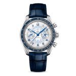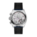 Ce modèle de 43 mm est réalisé en acier inoxydable avec un cadran argenté. Sa lunette en aluminium anodisé dotée d’une échelle tachymétrique est bleue, ses aiguilles feuille et ses chiffres arabes également, et elle arbore un motif circuit façon « spirale » unique qui se déroule sous les minutes