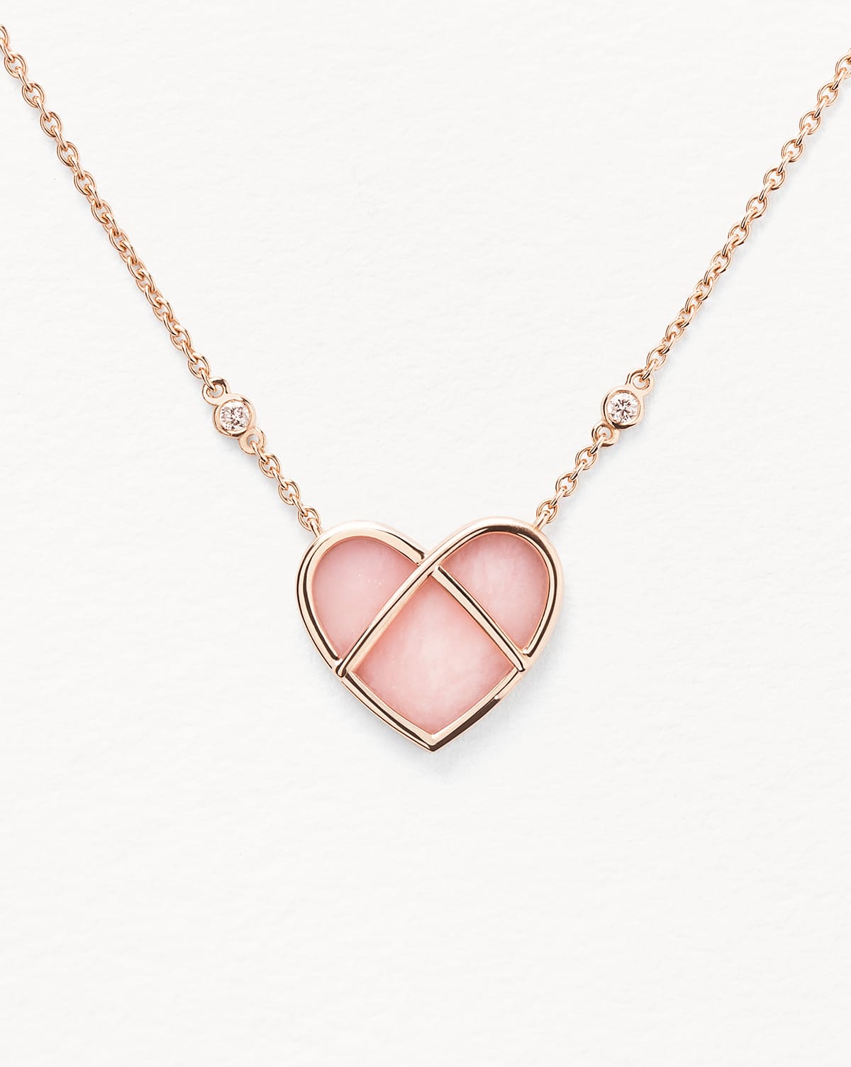 Collier L’Attrape-Cœur en or rose serti d’un coeur en opale rose sur chaîne ornée de 2 diamants.