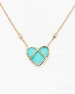 Collier L’Attrape-Cœur en or jaune serti d’un coeur en turquoise sur chaîne ornée de 2 diamants.