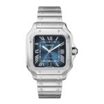 Montre Santos, grand modèle, mouvement mécanique à remontage automatique 1847 MC. Boîte en acier, couronne à 7 pans ornée d’un spinelle de synthèse facetté, cadran bleu dégradé, aiguilles en forme de glaive en acier, glace saphir. Bracelet acier avec système de mise à taille « SmartLink ». Deuxième bracelet en veau bleu marine, avec boucle déployante interchangeable en acier. Les deux bracelets sont équipés du système d’interchangeabilité « QuickSwitch ». Largeur de la boîte : 39,8 mm, épaisseur : 9,38 mm. Etanche jusqu’à 10 bars (~100 mètres).