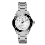 Conjuguant solidité, finesse et élégance, le boîtier de 36 mm associe l’acier brossé et poli. Il est surmonté d’une lunette noire en céramique résistante aux rayures.