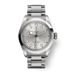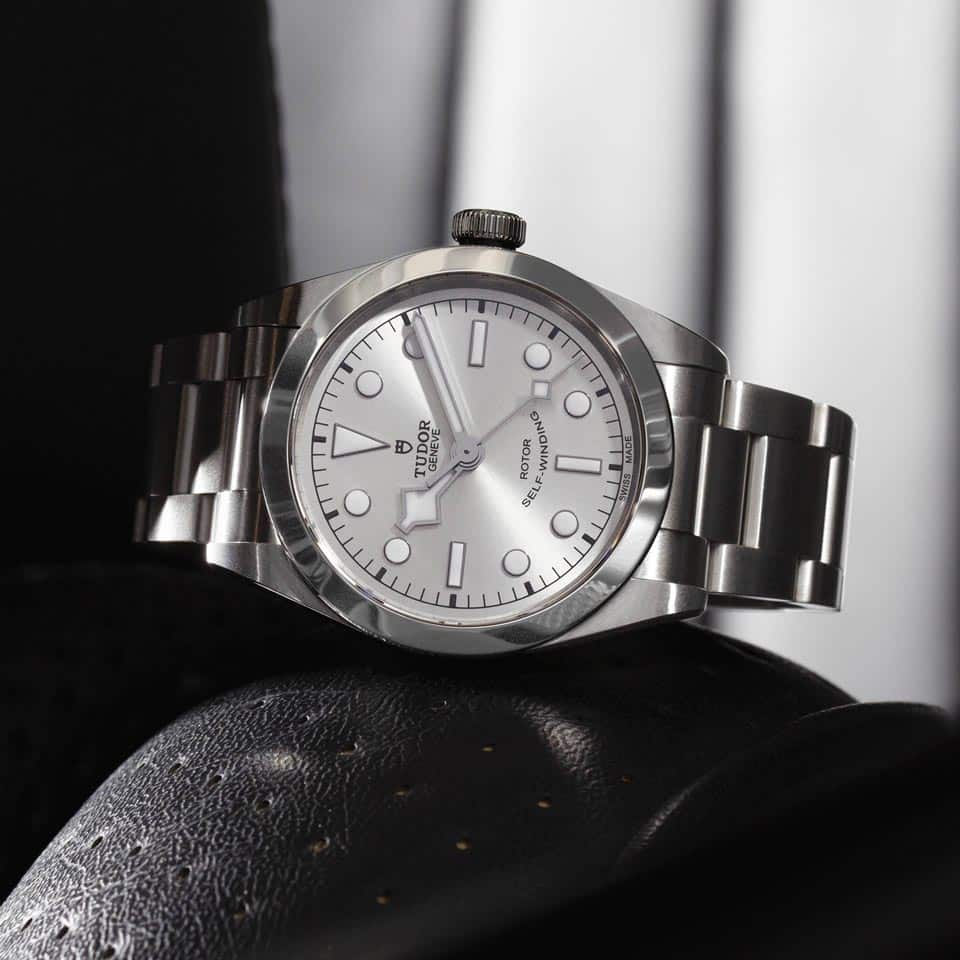 Couronne de remontoir en acier vissée ornée de la rose TUDOR en relief, avec tube de couronne en aluminium éloxé noir